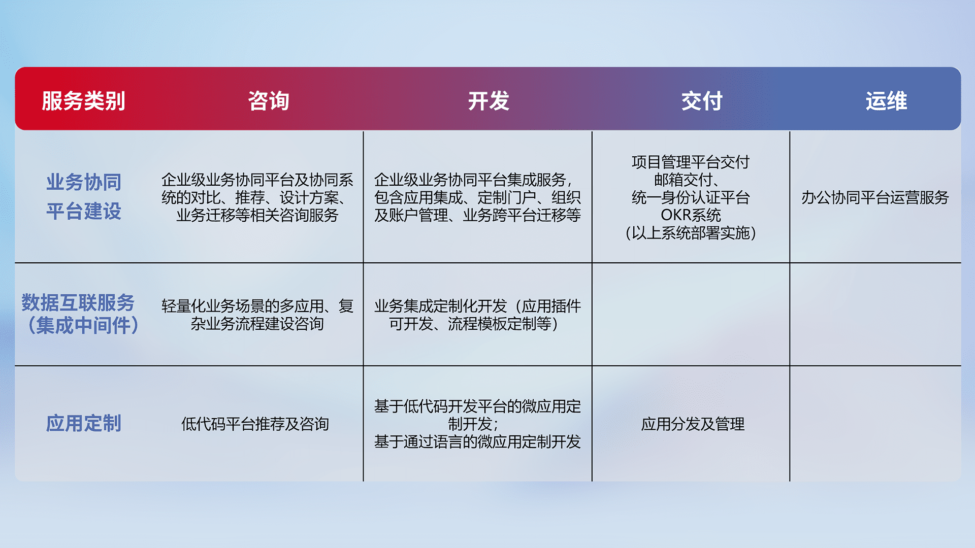 针对钉钉、、、、企微、、、IDaas等平台级产品提供产品的规划、、、方案、、、、交付、、、、定制化开发等服务,,,,实现如统一协同办公、、智能客户服务、、、混合会议管理、、、智能数据查询、、等业务场景,,,实现数字化转型。。